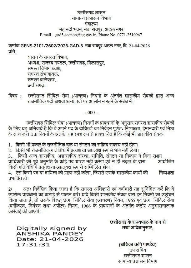 छत्तीसगढ़ सरकार ने सरकारी कर्मचारियों के राजनीतिक दल और अन्‍य संगठनों में सदस्‍यता लेने को लेकर कल यानी 22 अप्रैल 2026 को सामान्‍य प्रशासन विभाग ने आदेश जारी कर रोक लगाई थी. लेकिन अब इस फैसले को लेकर सरकार ने यू टर्न ले लिया है. सरकार ने राजनीतिक और अन्‍य संगठनों में शामिल होने पर लगाई गई रोक को हटा दिया है. सामान्‍य प्रशासन विभाग ने 21 अप्रैल को आदेश जारी किया था. वहीं 24 घंटे के भीतर विभाग ने नया आदेश जारी करके पुराने आदेश को रद्द कर दिया.