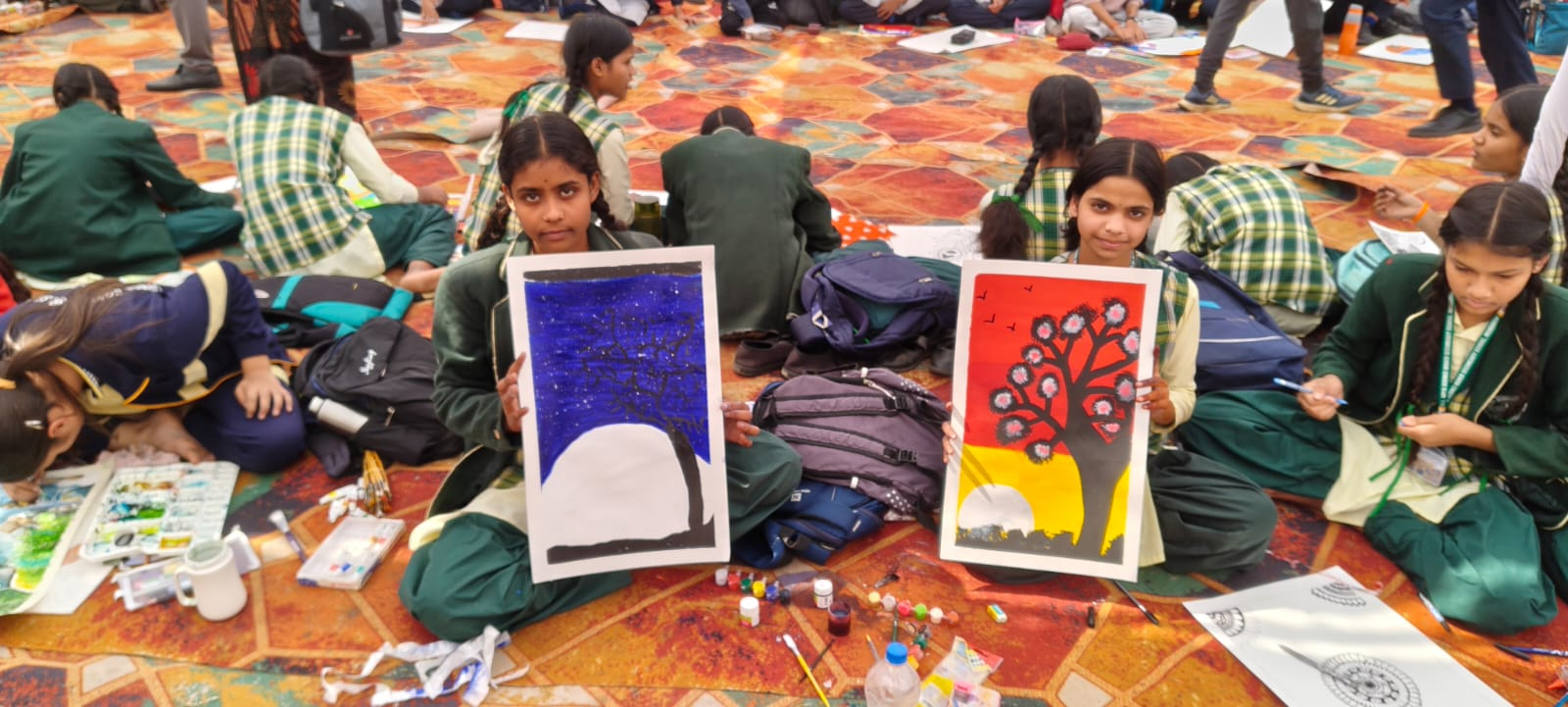 बच्चों ने नारी शक्ति, स्पेस टेक्नोलॉजी, प्रकृति, धर्म-आध्यात्म, (हनुमान जी, राधा-कृष्ण, शिव जी, प्रेमानंद जी, सनातन संस्कृति), ग्लोबल वार्मिंग, डिजिटलीकरण और तकनीक, पोर्ट्रेट, जानवरों की कलाकृतियां, कार्टून कैरेक्टर्स, मांडना आर्ट, जगन्नाथ जी, एलियन्स, देशभक्ति, तथा बुद्ध एवं महावीर जैसे विषयों पर शानदार पेंटिंग्स प्रस्तुत कीं।