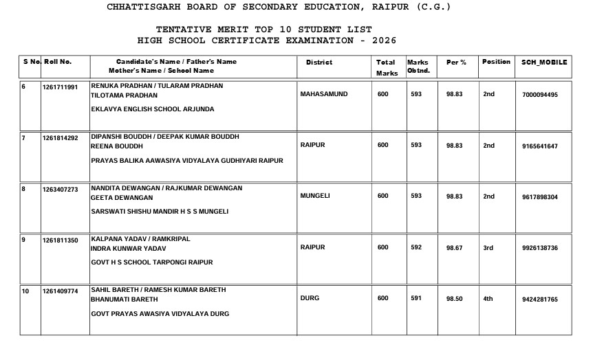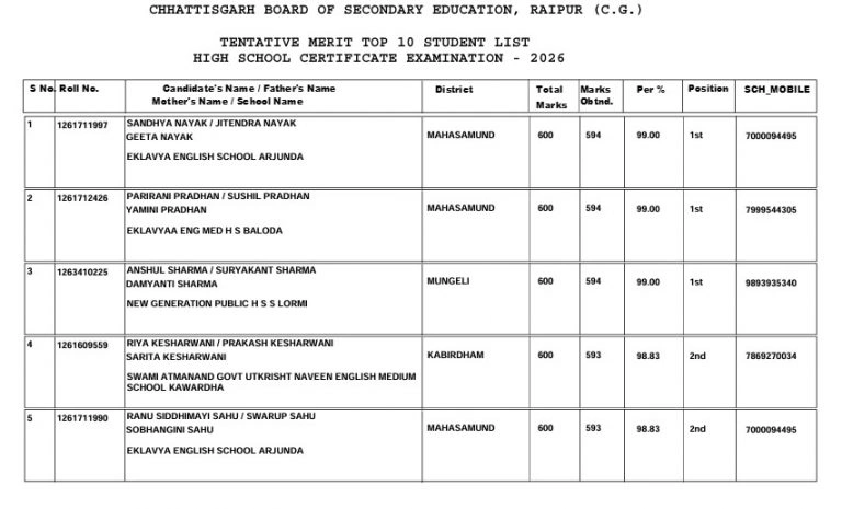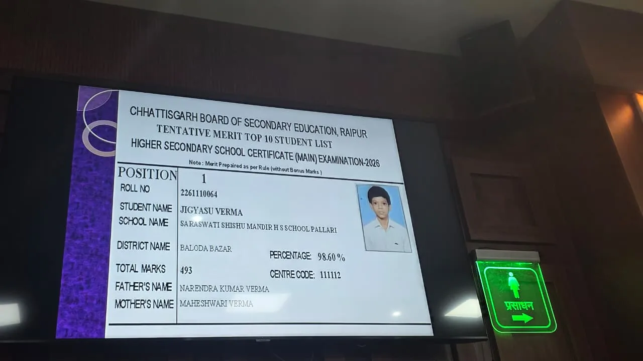 छत्तीसगढ़ बोर्ड ऑफ सेकेंडरी एजुकेशन, रायपुर द्वारा जारी 12वीं मुख्य परीक्षा 2026 की टेंटेटिव मेरिट सूची में बलौदा बाजार जिले के छात्र जिज्ञासु वर्मा ने पहला स्थान हासिल किया है। जिज्ञासु वर्मा ने 98.60 प्रतिशत अंक प्राप्त करते हुए कुल 500 में से 493 अंक हासिल किए। वे सरस्वती शिशु मंदिर हायर सेकेंडरी स्कूल, पलारी के छात्र हैं। उनके पिता का नाम नरेंद्र कुमार वर्मा और माता का नाम महेश्वरी वर्मा है। इस सफलता से परिवार, स्कूल और पूरे जिले में खुशी का माहौल है।