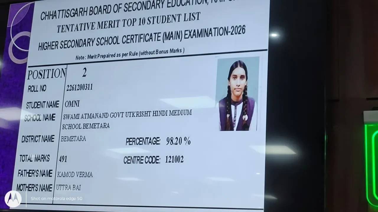 12वीं (हायर सेकेंडरी स्कूल सर्टिफिकेट) मुख्य परीक्षा 2026 की टेंटेटिव मेरिट सूची में बेमेतरा जिले के छात्र ओमनी ने दूसरा स्थान हासिल किया है। ओमनी ने 98.20 प्रतिशत अंक प्राप्त करते हुए कुल 500 में से 491 अंक हासिल किए। वे स्वामी आत्मानंद शासकीय उत्कृष्ट हिंदी माध्यम स्कूल, बेमेतरा के छात्र हैं। उनके पिता का नाम कमोद वर्मा और माता का नाम उत्तरा बाई है। इस शानदार उपलब्धि से परिवार, स्कूल और पूरे जिले में खुशी का माहौल है।